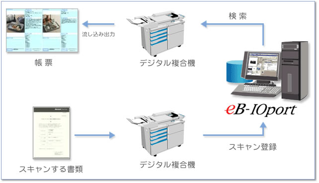 外部接続されたデジタル複合機等の入出力デバイスと連携して、eBASEserverの商品情報をダイレクトに検索表示し、指定帳票へ自動レイアウト出力が可能です。