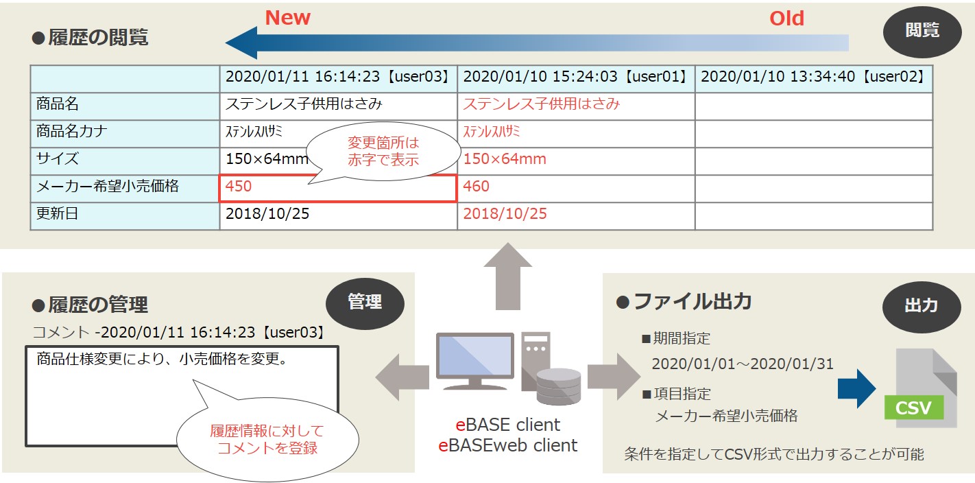 商品データの変更履歴を管理し、「いつ」、「だれが」、「なにを」、「どのように」変更したかを確認することができます。