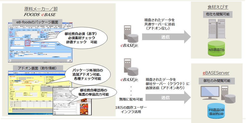 eBASEserverと連携し、eBASEjr. に登録した商品データを自動的にサーバーへ送信します。eBASEserver ユーザーが配布する無料ソフトで、eBASE の登録・編集・送信機能を搭載しています。