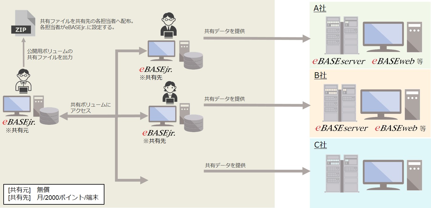 専用サーバーなどのミドルウェアを必要とせず、eBASEjr. または eBASEstandardの指定ボリュームを、他のeBASEjr.端末の共有ボリュームとして社内ネットワーク上で共有可能です。
