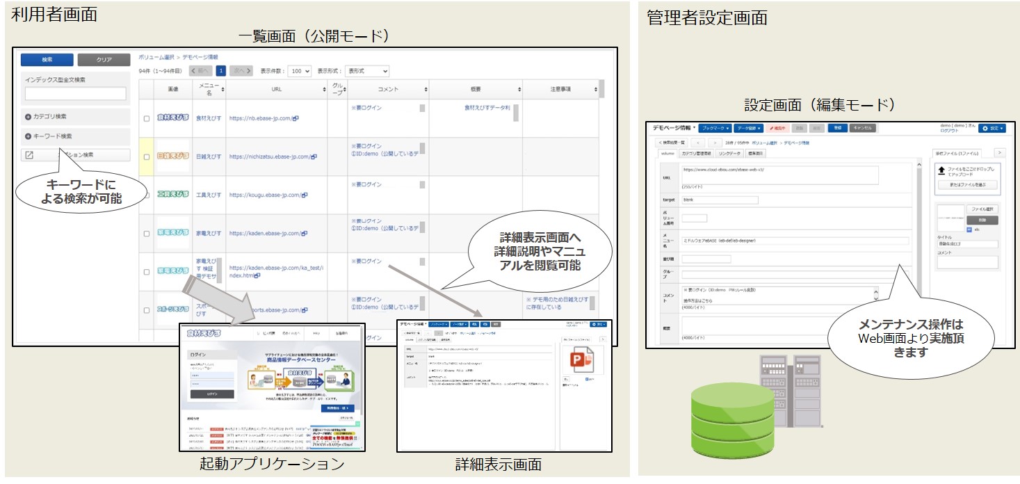 1台のeBASEサーバで、複数のeBASEアプリケーションをメニュー形式で設定・表示する事が出来る機能です。管理者設定により、アプリケーションへのリンクのみならずアプリアイコン・説明文の登録、メニュー表示可能です。また、各アプリケーションの詳細表示画面にてマニュアルなどのドキュメント添付・共有も可能です。