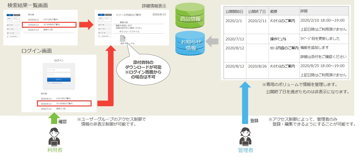 予めお知らせしたい情報(メンテナンス情報、システムの変更内容等)をデータベース上に登録しておくことで、特定の表示領域に情報を表示します。