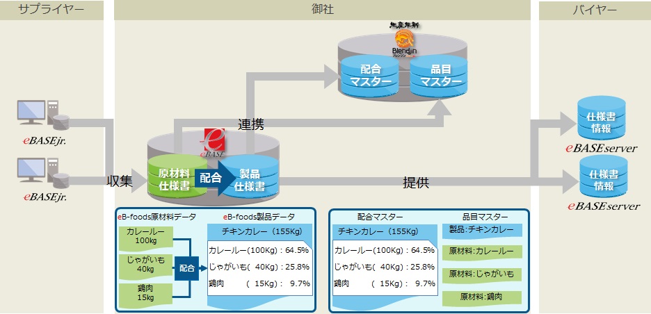アートシステム社:Blendjin(生産システム)にFOODSeBASEの原材料、製品、配合情報を専用画面を経由して連携する事が可能です。