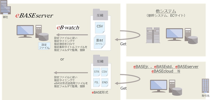他システムから出力されたCSVファイルや、eBASEシリーズからのデータを、定期的に監視して、自動的に一括登録する機能です。設定ファイルで細かいチューニングが行えます。eBASEのサーバー系ソフトウェアにバンドルされます。